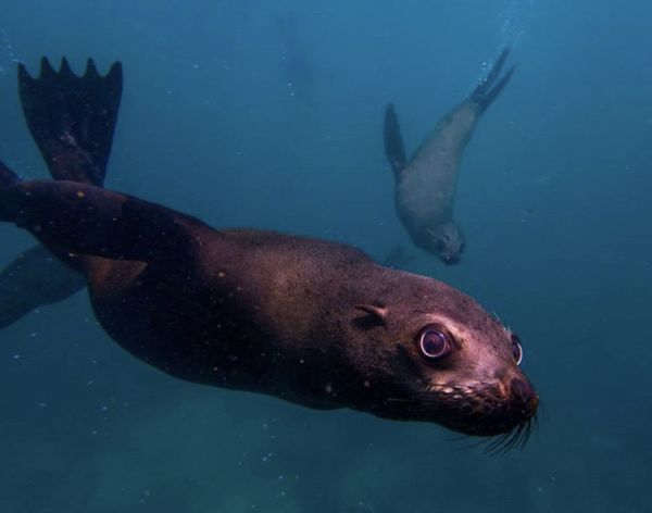 The Cape Fur Seal is abundant in the Western Cape and can be found playfully gliding amongst surfers at various spots along the coast; joining a feeding frenzy with other marine life, taking their chances by fishing for grub at the Hout Bay or Waterfront harbour or baking in the sun on one of our beautiful beaches or islands. Males who have reached sexual maturity within colonies will round up a group of females called a ‘harem’. Due to stocks of their preferred food items dropping in number seals have started to prey on other marine species like lobster, squid, small sharks, seagulls and penguins. Their well-developed eyes help them see in murky conditions while hunting. Additionally, they make use of their ‘whiskers’ known as vibrissa to sense and catch their prey and each whisker is mobile and controllable.